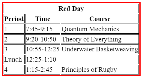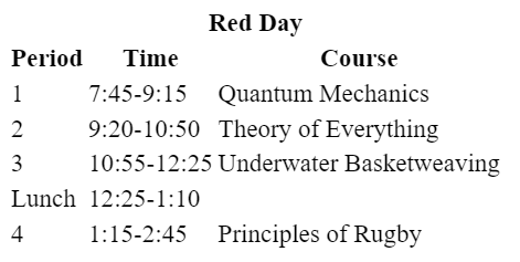 Add a heading to your page and also two tables (Red Day and Blue Day). Your tables should display your schedule for each day. For example: