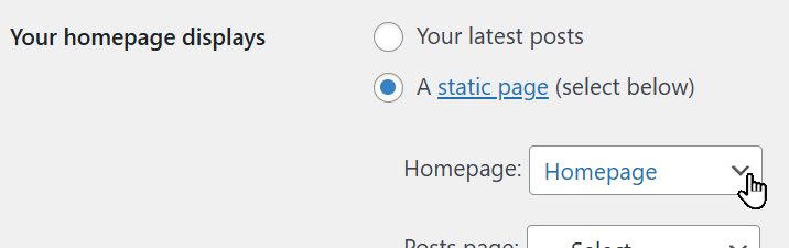Choose a static page for your home page and choose the page that you created: